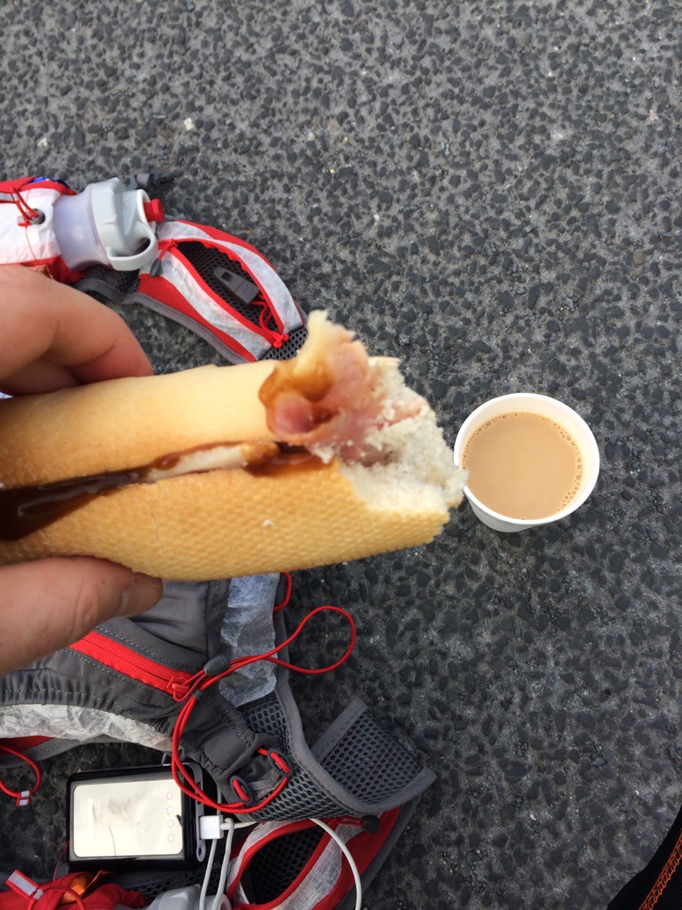 Both Brian and I had spent most of the first 24miles thinking about Bacon sandwiches and thankfully upon arrival there was a tray full of the stuff provided by Glen and Scoff – and scoff it down I did along with about a litre of hit delicious coffee and even more delicious fresh orange juice. This was a significant break with about 90 minutes left for everyone to play catchup and I used this as an opportunity to change from my ridiculously uncomfortable thunder crackers to something more pleasant and also add another tub of Vaseline to my nether regions.